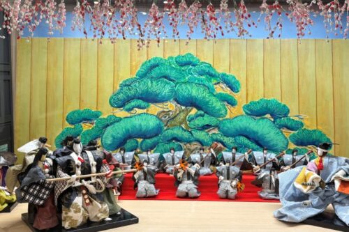 「藤娘」では背景の松は男性を、藤は女性を象徴しています。藤の絡んだ松の大木の前に藤の枝を持った娘姿の