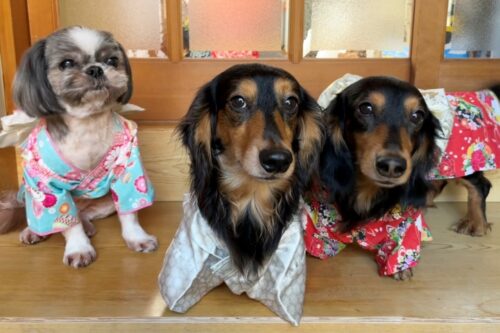 看板犬のポッポ、ピッピ、チビたちは浴衣を着て夏を満喫中です。